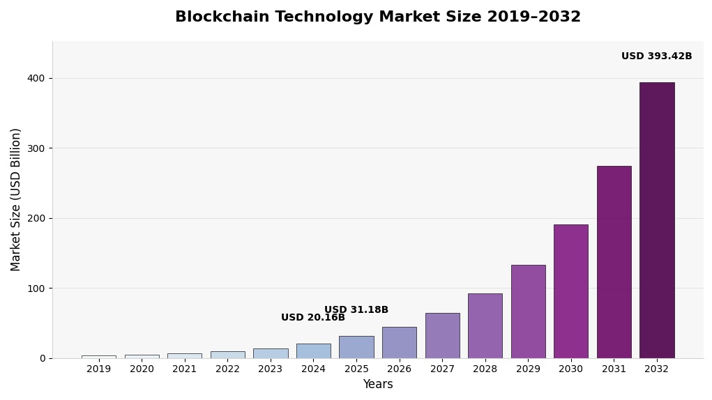 ブロックチェーン技術市場規模は2024年に201.6億米ドルに達し、2032年までに3,934.2億米ドルに拡大すると予測されています。この急成長は、デジタル化の進展、現実世界の資産のトークン化、そしてプログラム可能で常時接続の金融・データインフラへの移行によって牽引されています。企業は、パイロット段階から、決済、取引、コンプライアンス、資産登録などを含む実稼働システムへと事業を拡大しています。